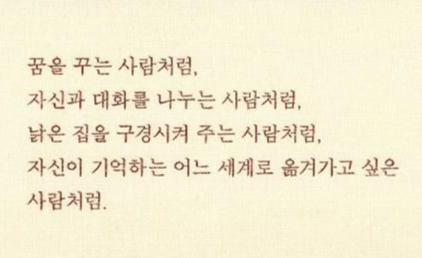 평일의 어떤 밤, 비 오는 어떤 밤, 아주 지친 어떤 밤, 오늘의 나처럼 현재를 살아야 한다는 말이 또는 미래를 향해 나아가야 한다는 말이 무겁게 느껴지신다면 잠시 과거에 다녀오셨으면 좋겠다. 포근하고 향기로운 냄새가 나는 어떤 기억 한 조각을 찾아, 꼭 꺼내보셨으면 좋겠다. [자신이 기억하는 어느 세계로 옮겨가고 싶은 사람처럼.*] 말이다.