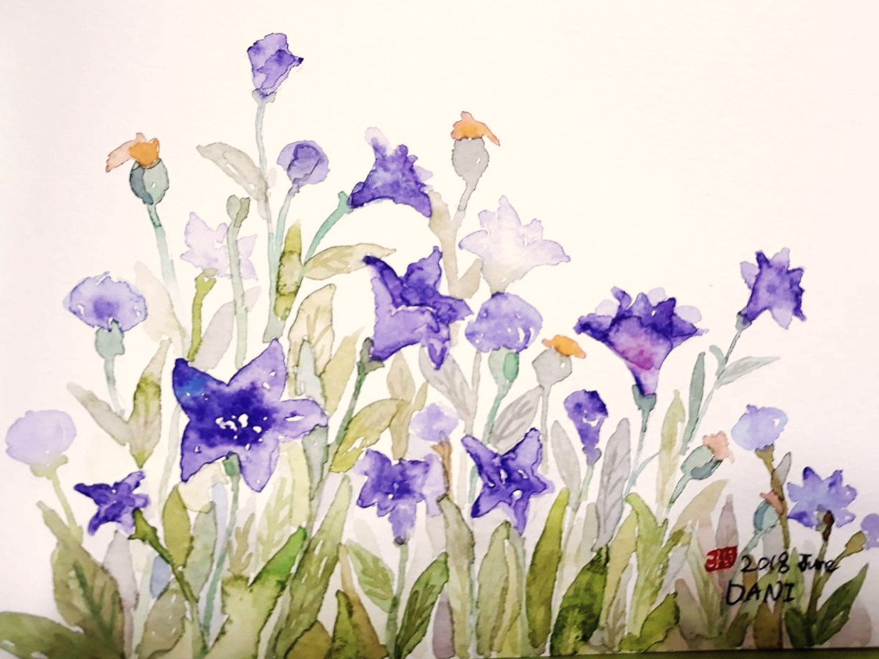 아이들을 어린이집에 맡기고 한복 바느질을 배우러 다니며 만난 텃밭에 핀 도라지꽃. 도라지꽃의 보랏빛이 꼭 내 가슴에 멍처럼 푸르구나 싶었다. -다녕 그림