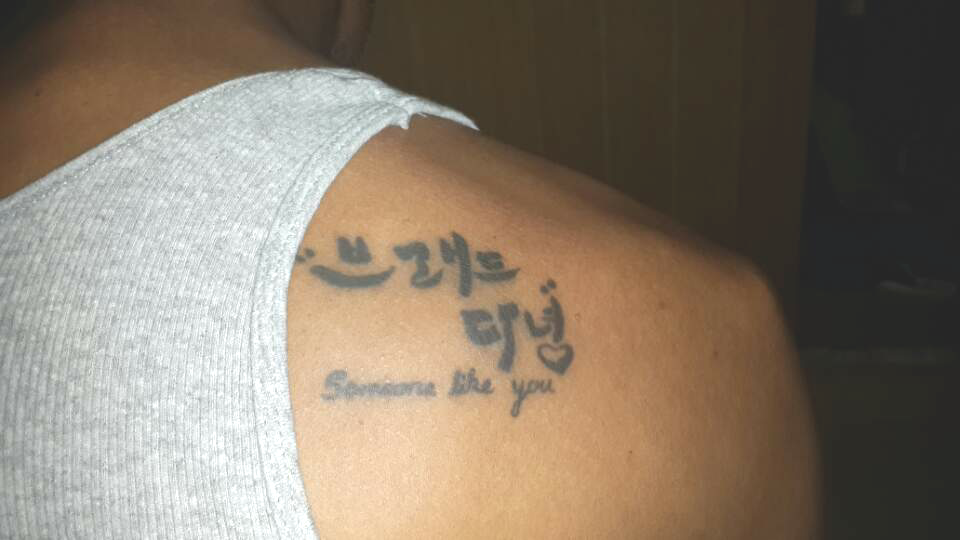 재혼 후, 호적에만 이름을 올린 게 아니라 남편의 등짝에도 이름을 올렸다. 남편이 자기 이름과 내 이름을 한글로 써 달라기에 붓펜으로 써 줬다. 그랬더니 그 모양 그대로 문신을 등짝에 얹어 온 것이었다.