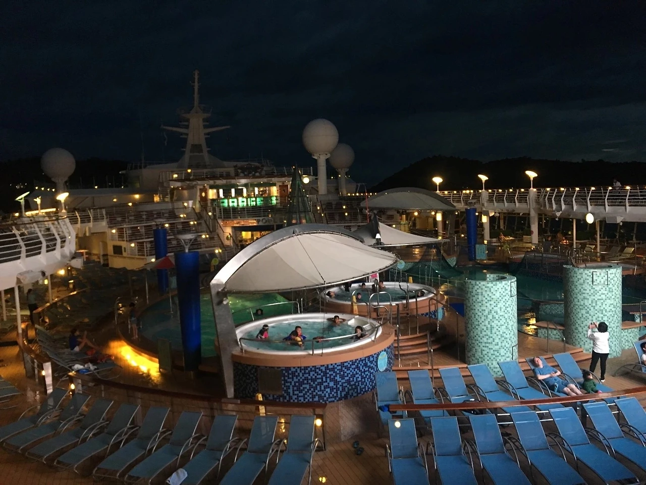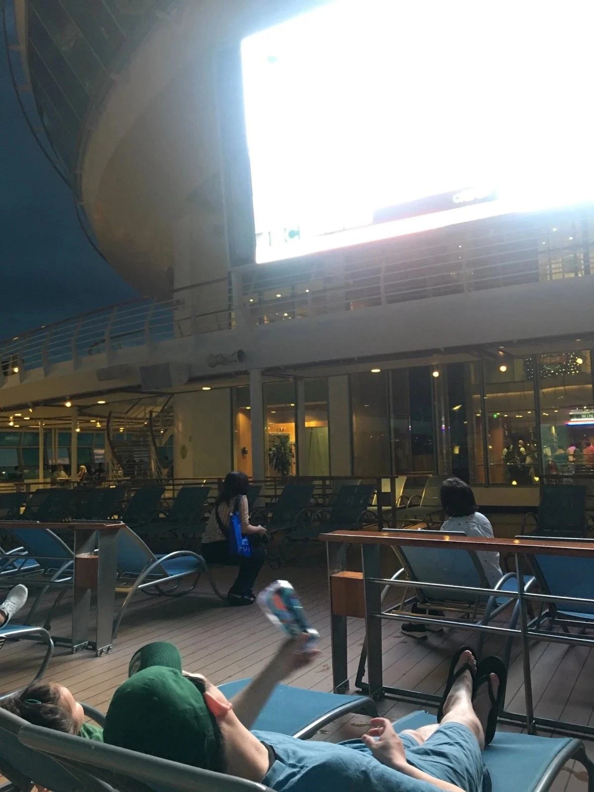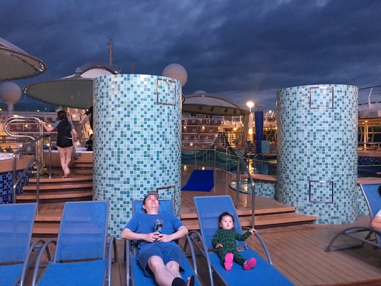 크루즈 여행 중이기에 우리는 야간 영화를 관람하기 위해 수영장 비치에 누웠다. 집에서 티비는 아이에게 금지된 리스트지만 이렇게 경치가 좋은 곳에선 예외다.