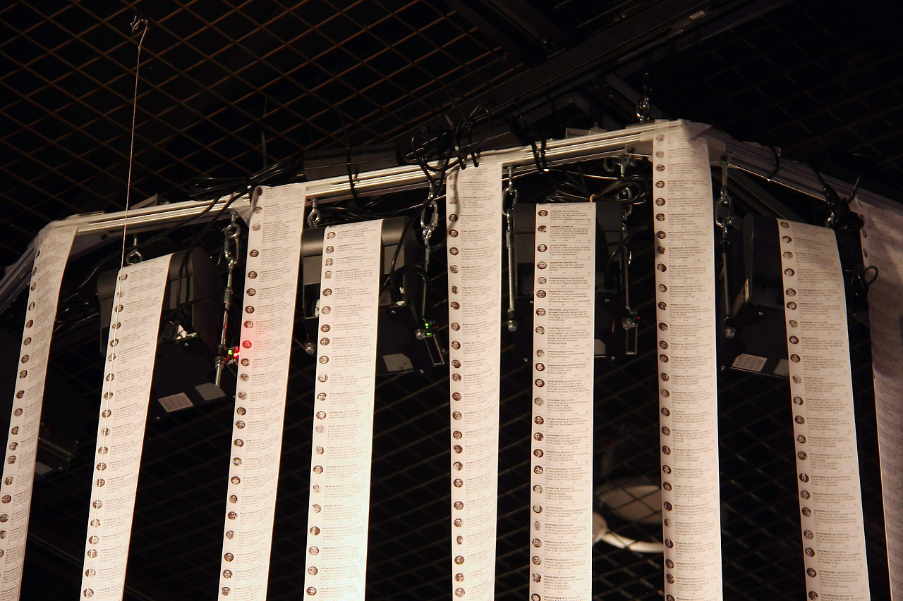 가장 먼저 눈에 띄는 것은 상단의 프린터를 통해 계속적으로 산출되는 종이 뭉치들이다. 종이 뭉치를 들여다보면, 다양한 트위터 유저가 포스팅한 수 많은 뉴스 내용들이 적혀 있으며, 이는 미국 대선 이후 가짜 뉴스라고 판별된 트위터 봇들이 산출한 약 200,000개의 포스팅을 LSTM 모델로 훈련시킨 결과물이다. 트위터 A.I 봇은 계속해서 트윗을 산출하며 자신을 진화시키고 발전시킨다.