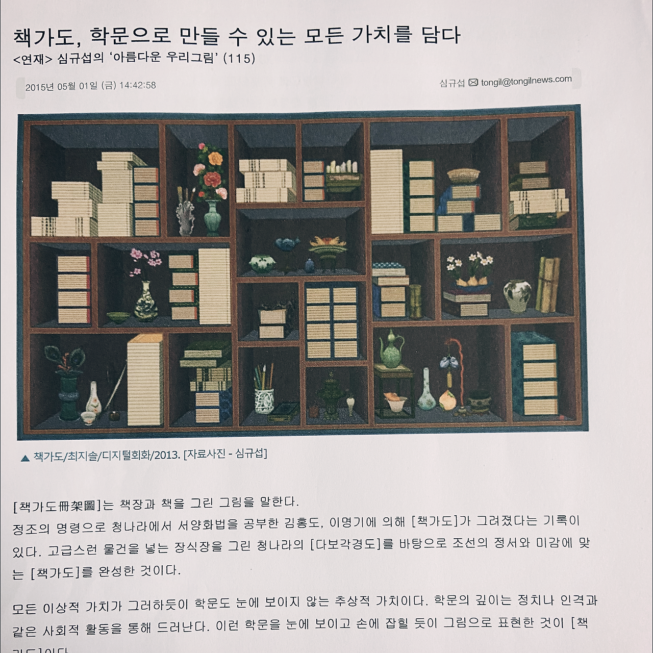 정조대왕이 김홍도에게 책가도를 그리게 했다는 역사적인 이야기를 읽었다. 정조대왕이 민심을 얻기 위해 했던 행동에 관한 것들도 있다. 그림으로 민심을 얻었다는 대목에서 정조대왕의 센스를 느낄 수 있었다. 책가도를 그리게 한 것은 선비들의 마음을 얻기 위한 것이었다. 정조대왕실록이 있다면 따로 챙겨 읽어야지. 다음 책 리스트가 추가된다.