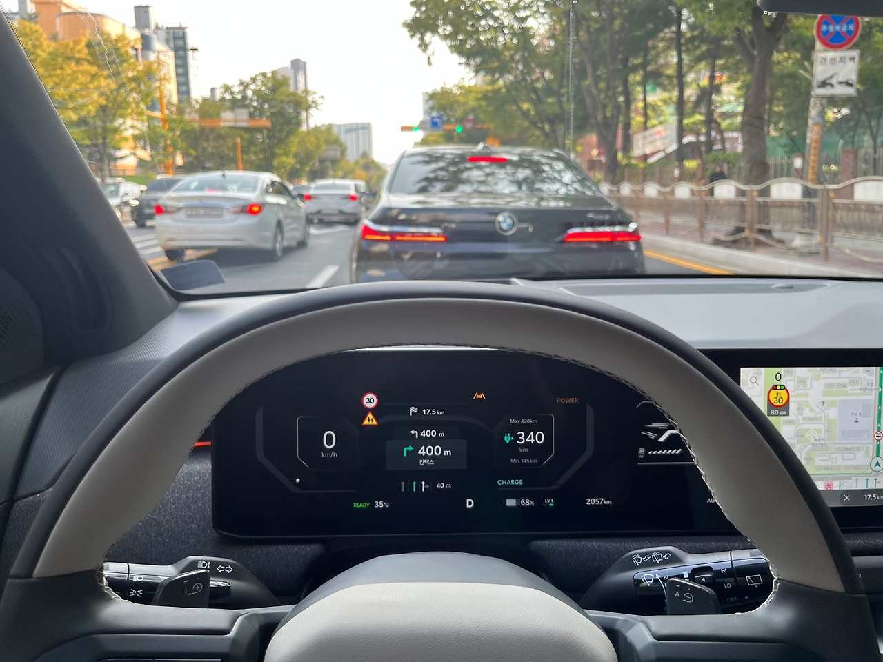 운전석 디자인도 아쉬운 부분이다. 처음 탑승했을 때, 시동 버튼이 보이지 않아 당황했는데, 핸들 뒤편에 있는 기어 레버 옆에 버튼이 있었다. 기어 레버 자체도 눈에 잘 띠지 않는데다가, 시동 버튼도 핸들 틈 사이로 간신히 보이는 수준이다. 차에 타서 가장 먼저 찾아야 하는 버튼인데, 굳이 여기에 둔 이유는 알 수 없다. 주차 모드 버튼도 썩 직관적이지 않다. 기아 전기차를 처음 타는 운전자라면 좀 당황스러울 것 같다. 이런 시동 버튼 디자인은 EV9에서 처음 선보였는데, 납득하기 어려운 디자인이다.