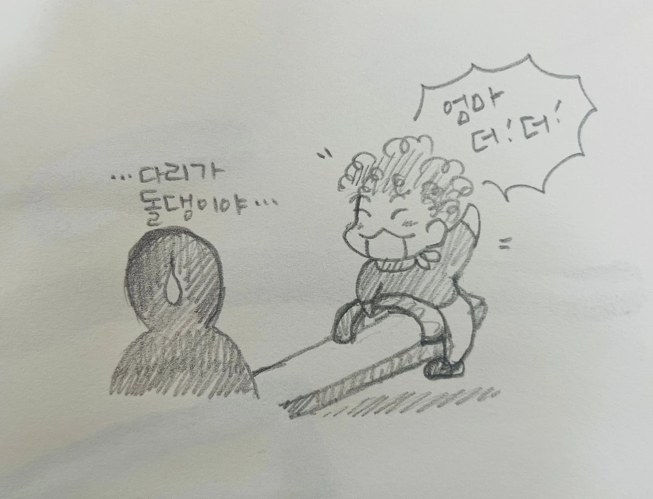 팔로 시소를 눌러서 놀아줄 수도 있긴 하다. 한동안 사용했던 나의 꼼수이기도 하다. 하지만 아이들의 눈에 만족스럽지 않은 경우가 대부분이다. 아무래도 주거니 받거니, 티키타가가 있어야 재미있는 게 시소니까. 나도 나름 평소에 운동을 하던 가닥이 있어서 지구력이나 근력 하나는 자신 있는 편이다. 그런데 시소는 정말 어렵다. 내 무게를 그대로 박차고 튀어 오르는 건 스쿼트나 런지와는 전혀 다른 느낌이다. 시소는 오직 “얘야, 너만 즐겁다면 엄마는 내일 못 걸어도 좋다.”의 느낌으로 놀아주는 놀이기구다.
