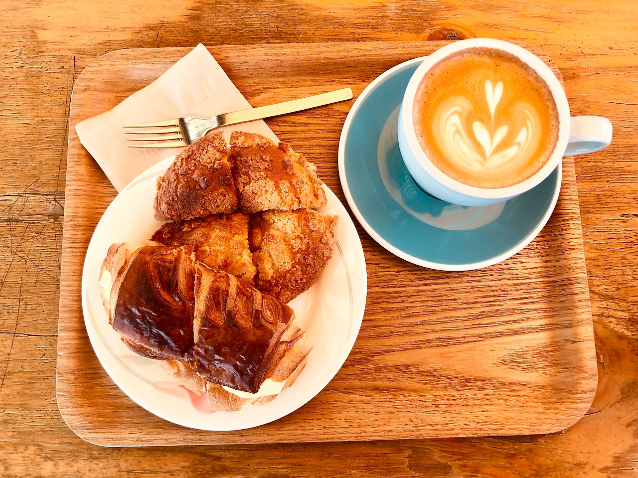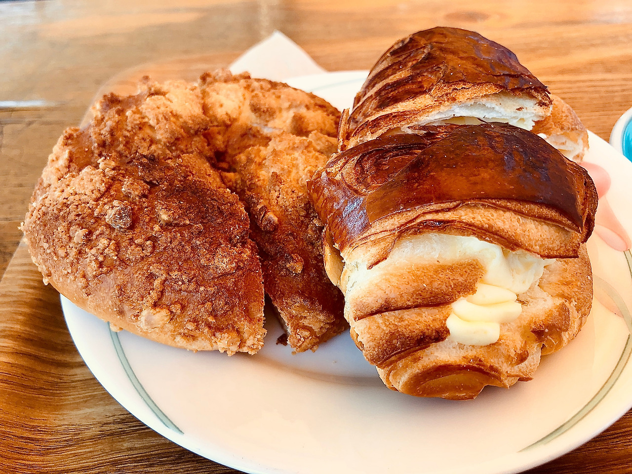 풍기는 냄새로 보아 팔고 있는 모든 빵을 다 먹어보고 싶었지만 그럴 수 없기에 다른 데서는 잘 먹지 못하는 신기한 빵인, 크림 크루 와 기본 빵중의 기본 소보루를 쟁반에 담고 커피는플랫 화이트를 주문한다.