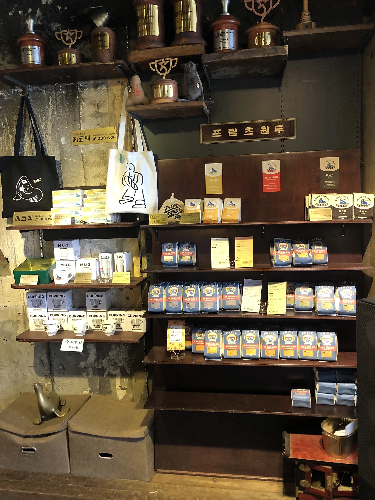 종류별로 커피 원두를 진열해 놓은 선반과 테이블을 지나니 한쪽 구석에서는 가방이나 컵 같은 프릳츠 브랜드한 굿즈가 전시되어 있다. 마치 제과 브랜드 해태의 캐릭터와 비슷한 형상으로 레토르 감성을 좋아하는 손님들에게 제법 인기는 듯하다.