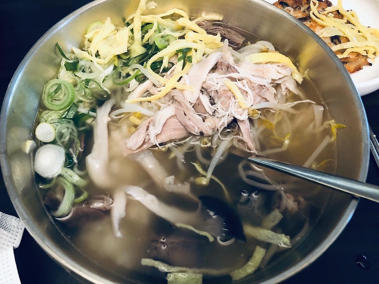 평양 3대 음식인 평양 온반은 꿩, 닭 혹은 쇠고기를 삶은 육수에 갖가지 고명을 얹어 먹는 장국밥의 한 종류이다. 일종의 북한식 육개장 혹은 닭개장이라고 할 수 있겠다. 남한이 고춧가루를 기본 양념으로 하여 얼큰하고 시원한 맛을 낸다면 이북 쪽은 곰탕처럼 맑고 구수한 맛을 특징으로 한다. 어렸을 적 남북정상회담에서 오찬메뉴로 나와 화제가 되었지만 먹어보지는 못했던 그 추억 속 갈증을 찾아 오늘 평양 온반을 먹어보았다. 주문한지 몇 분쯤 지났을까. 오래 걸리지 않아, 온반이 내 앞에 놓여졌다. 맑은 닭개장이었다. 적당한 양의 밥에 뜨거운 닭 육수를 붓고 그 위에 잘게 자른 닭고기, 숙주, 버섯, 계란 지단과 큼지막하게 썰은 대파 같은 고명들이 얹어 나왔다. 국밥이 담긴 스테인레스 그릇에 푸짐한 고명들이 비춰 온반을 더 먹음직 스럽고 맛깔라게 보이게 했다.