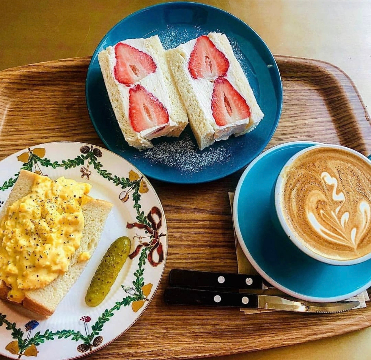 햇볕이 잘 드는 통유리 앞에 자리를 잡고 주문을 한다. 여기서 제일 유명한 생크림과일산도, 에그 산도 그리고 라떼를 시킨다. 산도카페는 아메리카노와 라떼가 서로 다른 원두를 사용하는데, 전자는 약간의 과일산미의 풍미가 후자는 다크 초컬릿의 씁쓸하고 달콤한 맛을 쓴다고 한다. 따뜻한 라떼를 받아서 마셔보니 설명대로 묵직한 여운이 남는 다크 블렌드. 부드럽고 고소한 우유 거품과 썩 잘 어울리는 맛이다.
