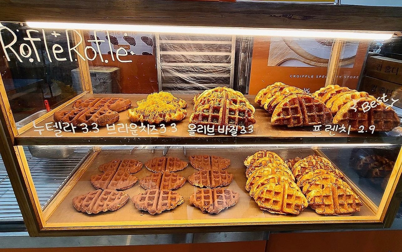 줄 마지막 부분에 서서 구경하는 크로플은 정말 신세계였다. 어쩌면 줄이 길어 다행이었다. 천천히 유리창 안으로 맛있는 크로플을 마음껏 구경할 수 있으니. 빵 굽는 고소한 냄새를 실컷 맡으면서 크로플들이 잔뜩 진열된 걸 보니 절로 흥이 나고 신이 나서 춤이라도 추고 싶은 심정이었다.