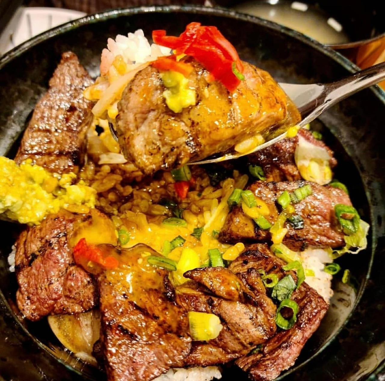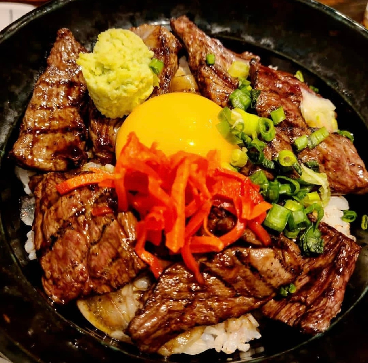 메뉴는 양식과 일식의 콜라보. 다양한 가츠 정식, 덮밥, 파스타, 샐러드가 있었다. 우리는 다양하게 먹어보자며 간장에 조린 스테이크를 덮은 야키니쿠동, 체다와 모짜렐라 치즈가 들어있는 소고기치즈가츠 그리고 바질페스토에 명란을 얹은 명란바질오일 파스타를 시켰다.