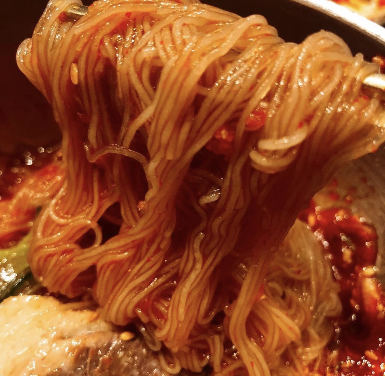 춘천 막국수 스타일이다. 살얼음이 살짝 낀 시원한 육수를 자박히 붓고 그 위에 면을 말아 올린다음 양념장을 끼어 냈다. 고명은 절임무와 자른 사태 그리고 삶은 달걀 반개가 올라 있었다. 가위로 가로 세로로 한번씩만 자른 후 면을 돌돌 말아 야무지게 한입 먹는다. 시원하면서 매콤하고 또 졸깃했다. 후루룩 후루룩 맛있는 소리가 났다.