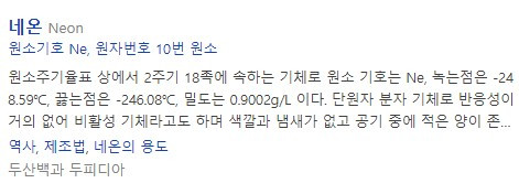 사전에 네온은 기체 원소라고 되어 있다. 전광판으로 많이 사용했던 네온사인으로 유명하다. 또 프레젠테이션 할 때 사용하는 붉은색 빛을 내는 포인터, 피부과에서 사용하는 붉은색 빛이 나오는 레이저 등도 네온을 사용한다.