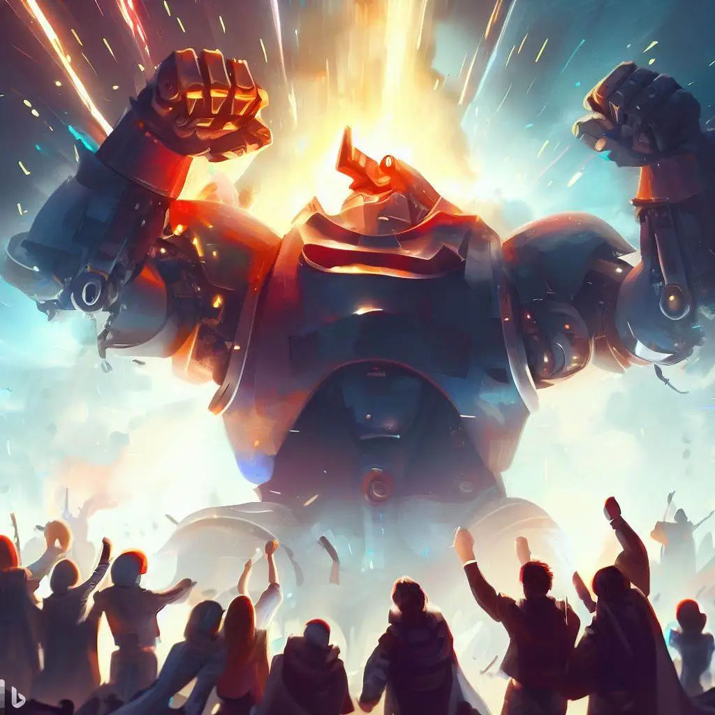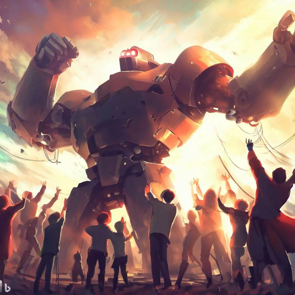 사람들은 거대로봇의 승리를 축하합니다