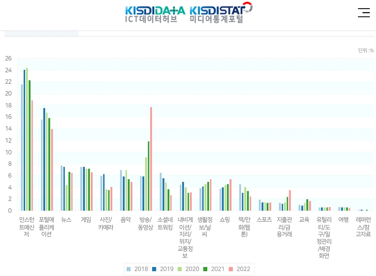 2018년부터 2022년까지 방송/동영상 사용 시간 비율이 가장 크게 증가했습니다. (5.9%에서 17.6%로 증가) 인스턴트 메신저, 포털 애플리케이션, 뉴스, 게임, 사진/카메라, 음악, 소셜 네트워킹, 책/만화(웹툰) 사용 시간 비율은 감소했습니다