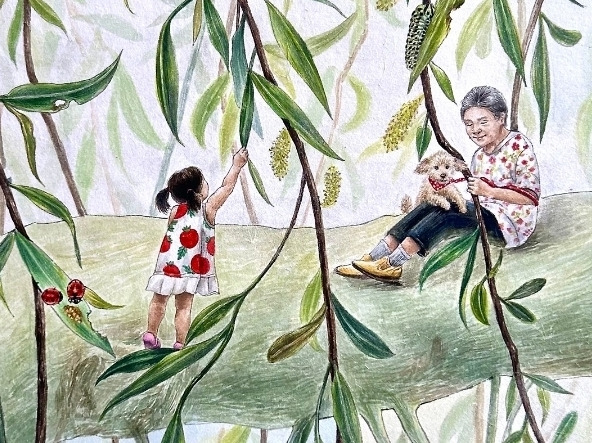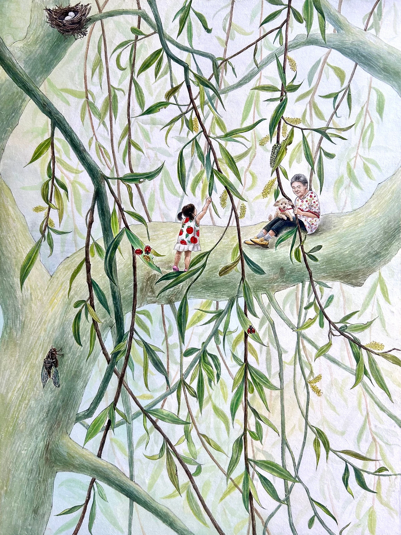 초록빛의 기억, 80*60cm, 순지에 수묵담채 (그림 속에 쏘피가 있어요♡)
