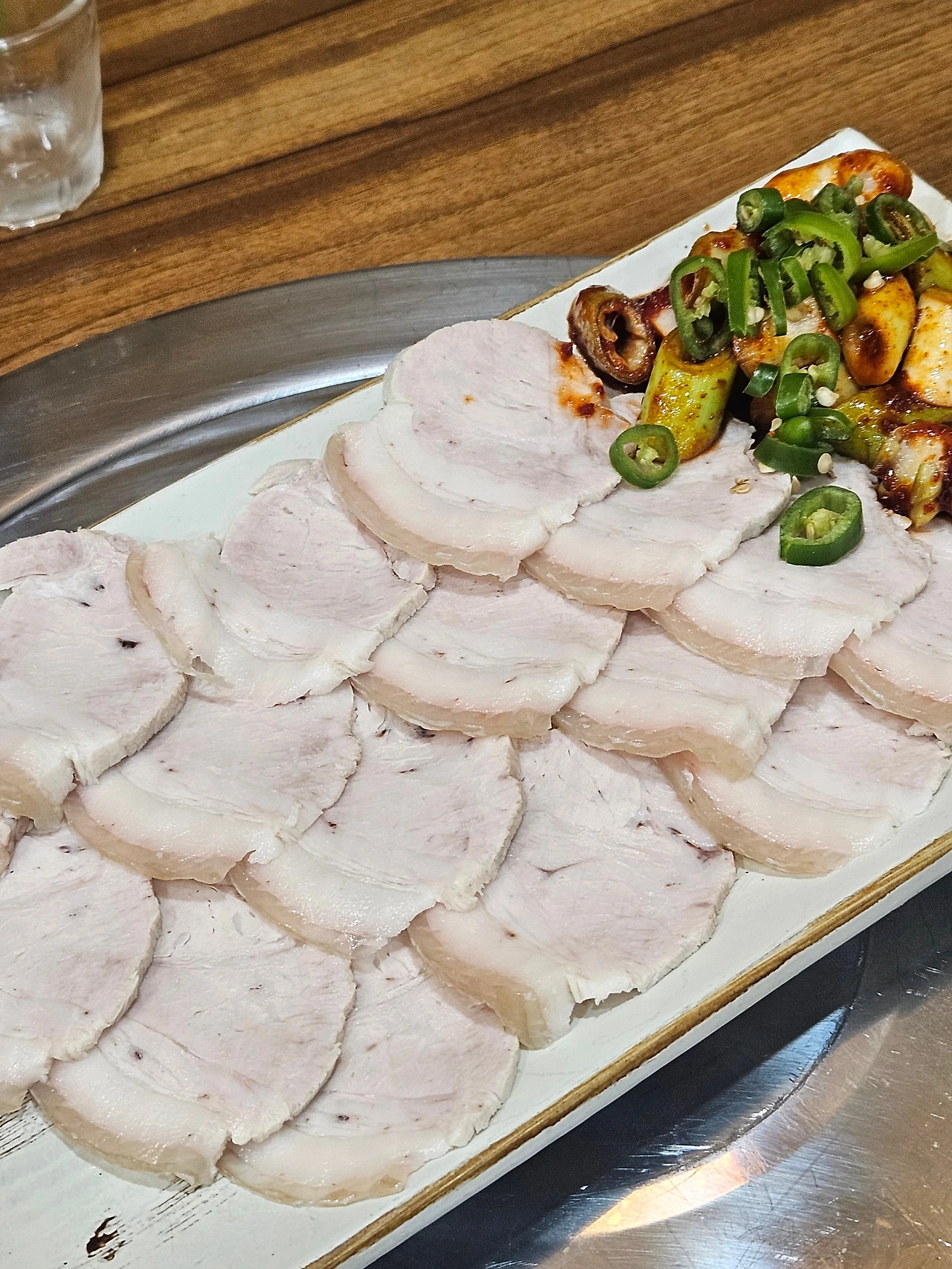살코기와 비계의 비율도 좋은 편이다. 비계가 그리 많지 않아서 지나치게 느끼하지 않은 것 같다. 살코기는 쫀득하다. 너무 질기지 않은 건 얇게 썰었기 때문인 것 같다. 그래서 먹기에도 불편하지 않고 씹기에도 부족함이 없다.