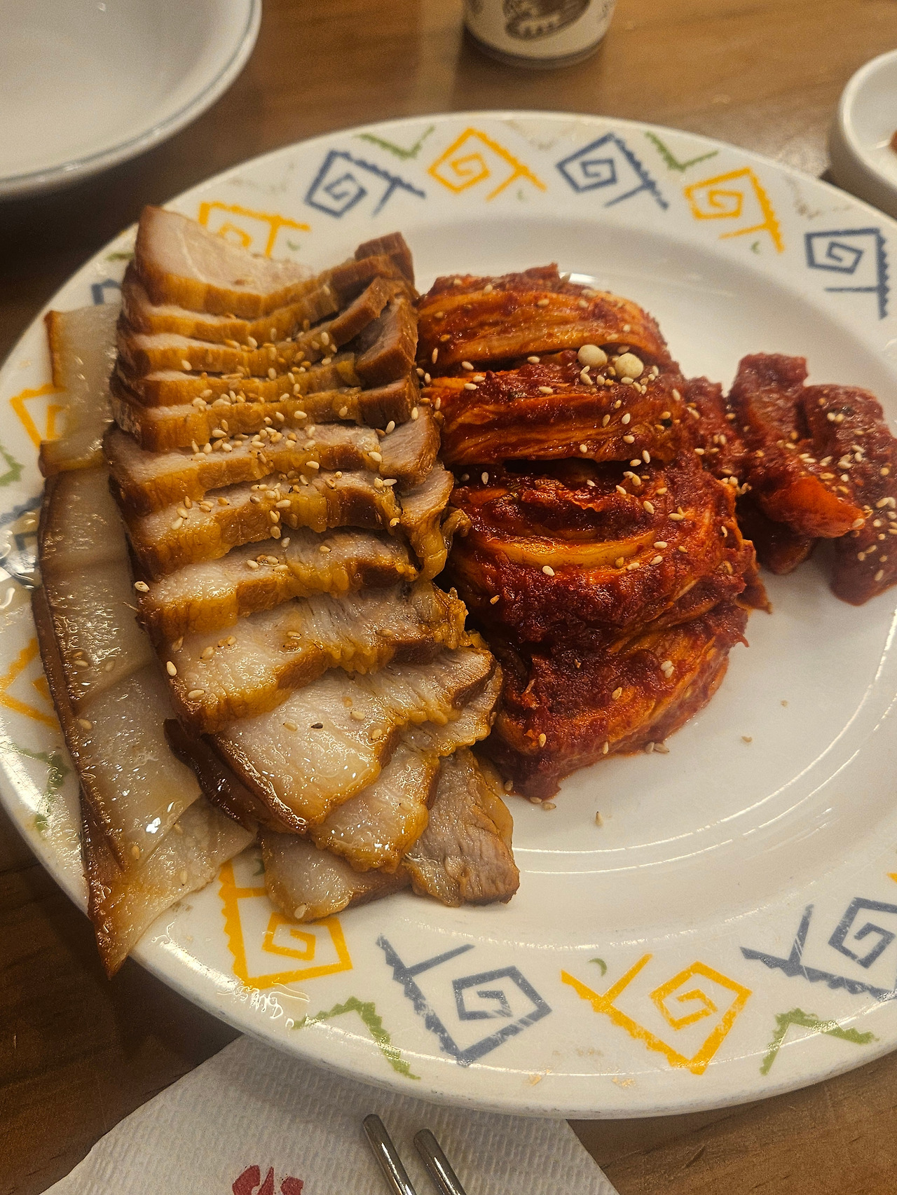 고기의 기름도 장난이 아니었다. 부위가 삼겹살, 거기에 껍질도 살짝 있는 오겹살 느낌이다 보니 기름이 좔좔 흘렀다. 윤기가 흐르는 겉모습만 봐도 맛이 없을 수가 없는 느낌이다. 자칫 느끼할 수도 있지만, 그건 김치가 있어서 괜찮다. 오히려 기름이 가득하다 보니 고기가 식어도 맛있다. 신기하다. 어떻게 이렇게 자극적인 고기를, 느끼하지 않게 잘 만들 수 있을까.