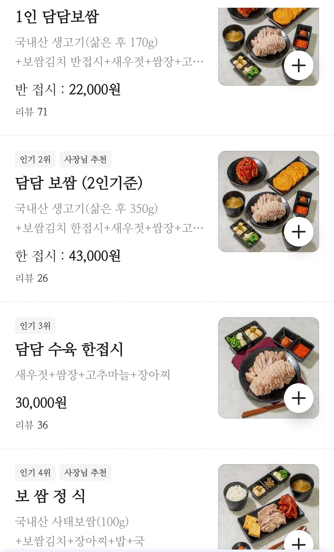 아쉬운 점은 정식에는 밥이 있지만 1인 담담보쌈은 밥이 없다. 아무렴 어떤가. 가성비로 고기를 잔뜩 먹을 수 있으니.