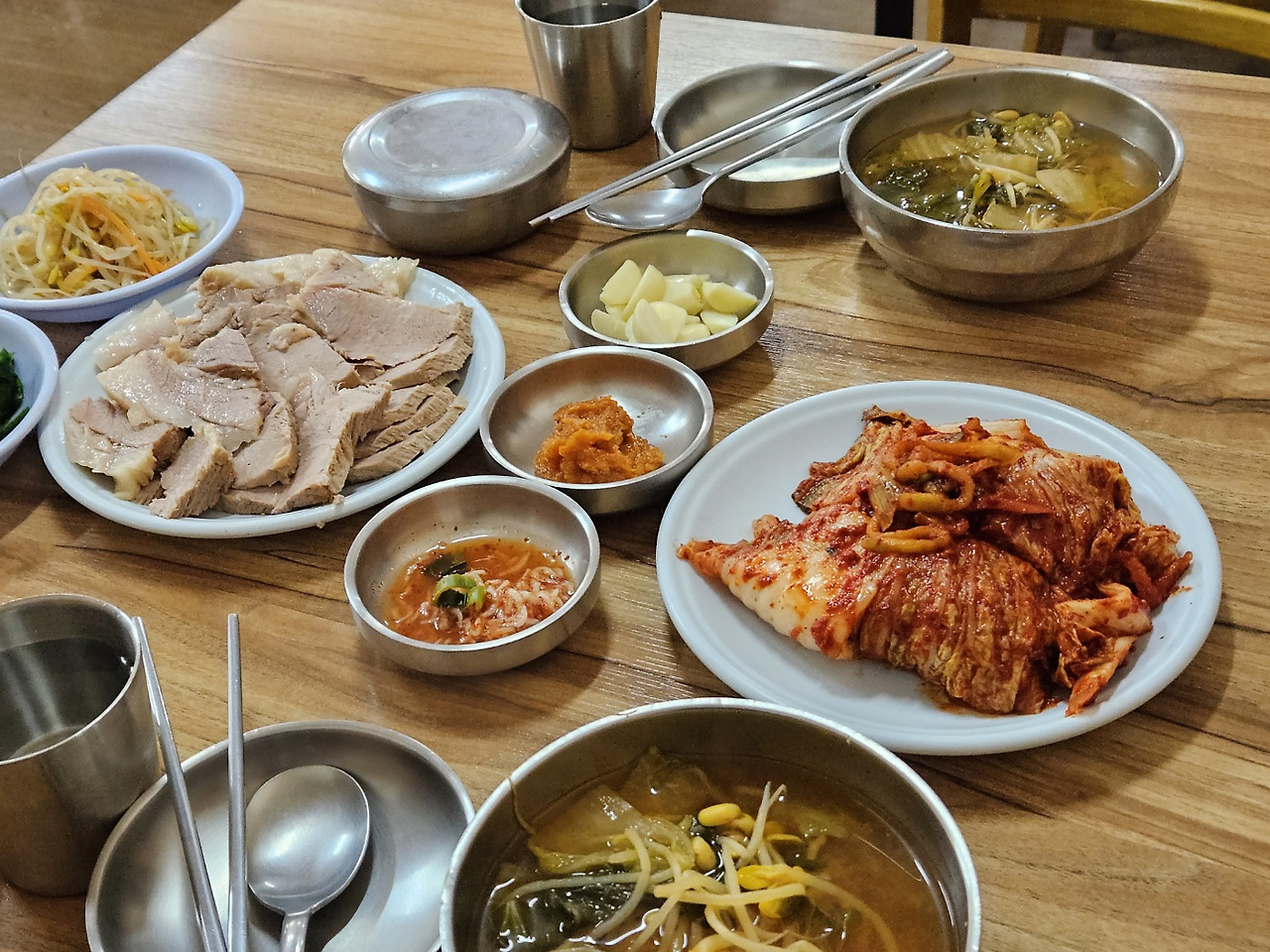반찬은 간단하다. 보쌈을 헤치지 않는 수준이다. 콩나물 무침과 부추 무침, 마늘 등이 나온다. 그리고 콩나물 시래기 된장국으로 추정되는 국이 나오는데, 나쁘지 않다. 이들로 입을 달궈놓으면 떼깔 고운 김치와 부드러워보이는 돼지고기가 등장한다.