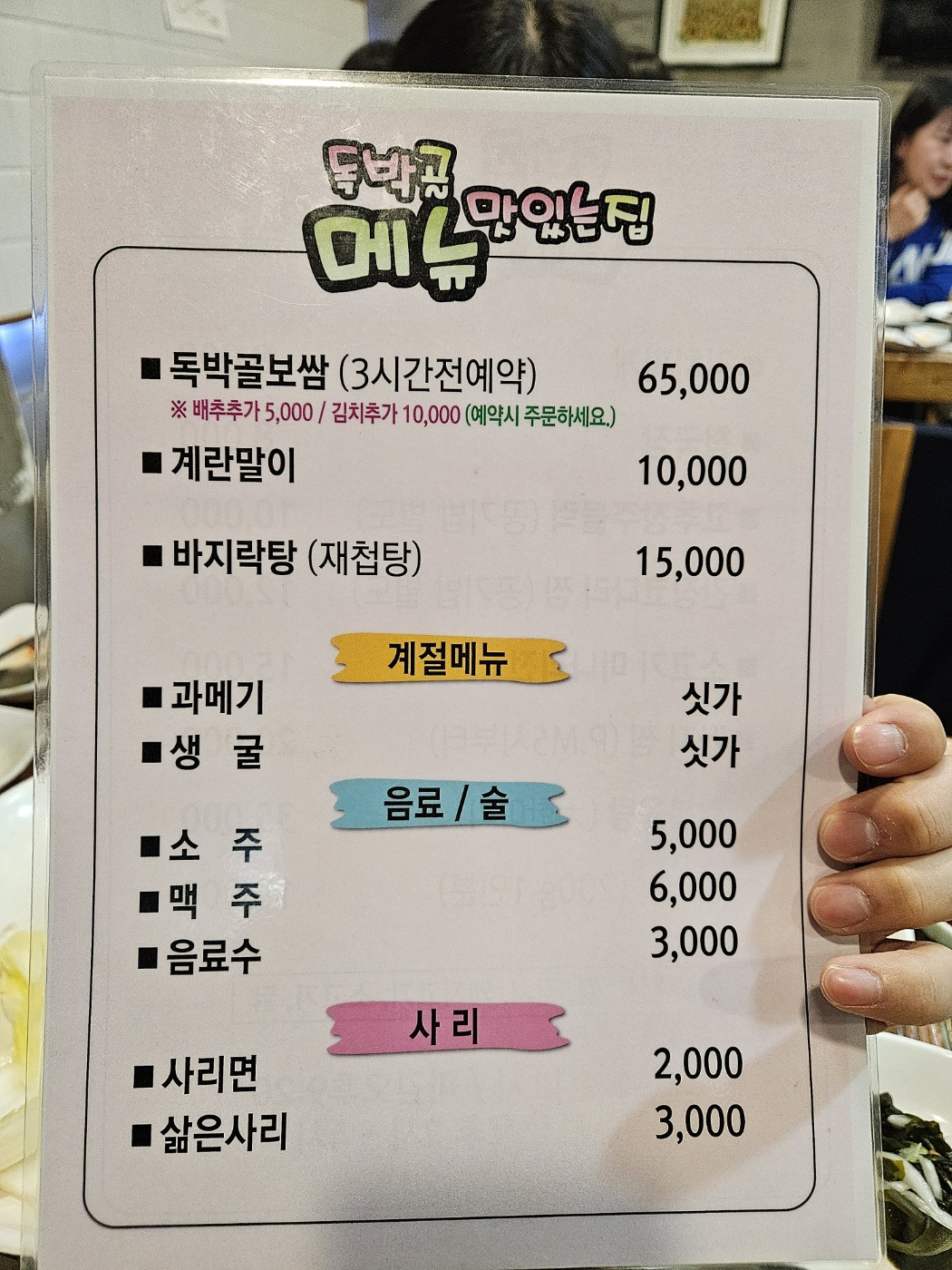 이 집 보쌈은 상당히 비싸다. 6만5000원이다. 그 가격을 내고 먹을 정도인지는 뒤에서 설명하겠다. 자리에 앉아서 보쌈을 시키고, 이 집의 또 다른 인기 음식인 코다리찜을 시킨다. 뭔가 잘 어울릴 것 같다.