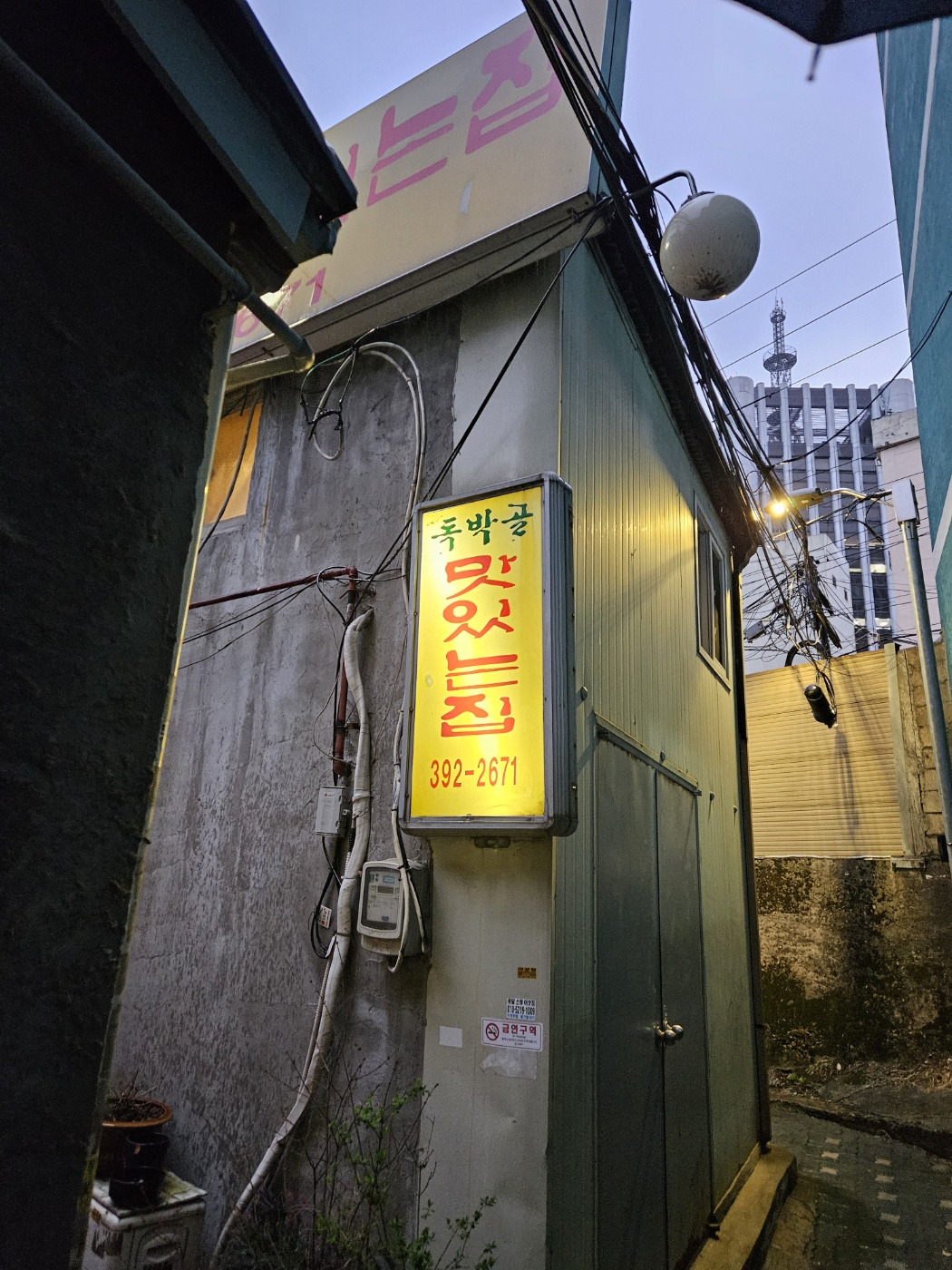 충정로역 3번 출구를 나와 7분 정도 걸어가다 보면 '해브커피'라는 카페가 나온다. 이 카페를 끼고 골목으로 들어가면 골목 끄트머리 좌측에 가게가 하나 나온다. '맛있는 집'이라는 빨간 글씨가 음산하게 써져 있고, 그 위에는 '독박골'이라는 단어가 쓰여있다.