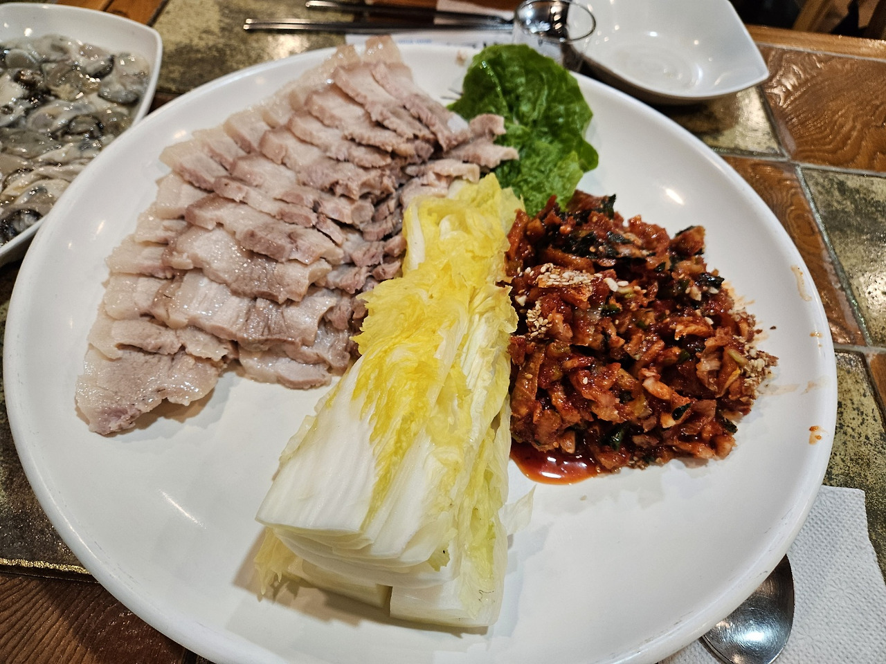 이 집 보쌈의 구성은 알차다. 오겹살 수육과 보쌈김치, 그리고 절인 배추가 나온다.