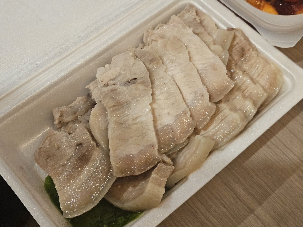 한입 먹는 순간 기름이 확 몰려온다. 돼지고기 기름치곤 냄새가 별로 나지 않는데, 육향이 강하게 남아있을 뿐이지 잡내는 없앴기 때문이다. 그 비법이 정말 궁금하다. 거의 물로만 수육을 만든 것처럼 아무런 양념의 맛이 느껴지지 않았는데 대파와 생강 정도 들어갔으려나. 하지만 생강의 향도 나지 않았다. 후추, 대파뿌리 뭐 그 정도가 생각났다.
