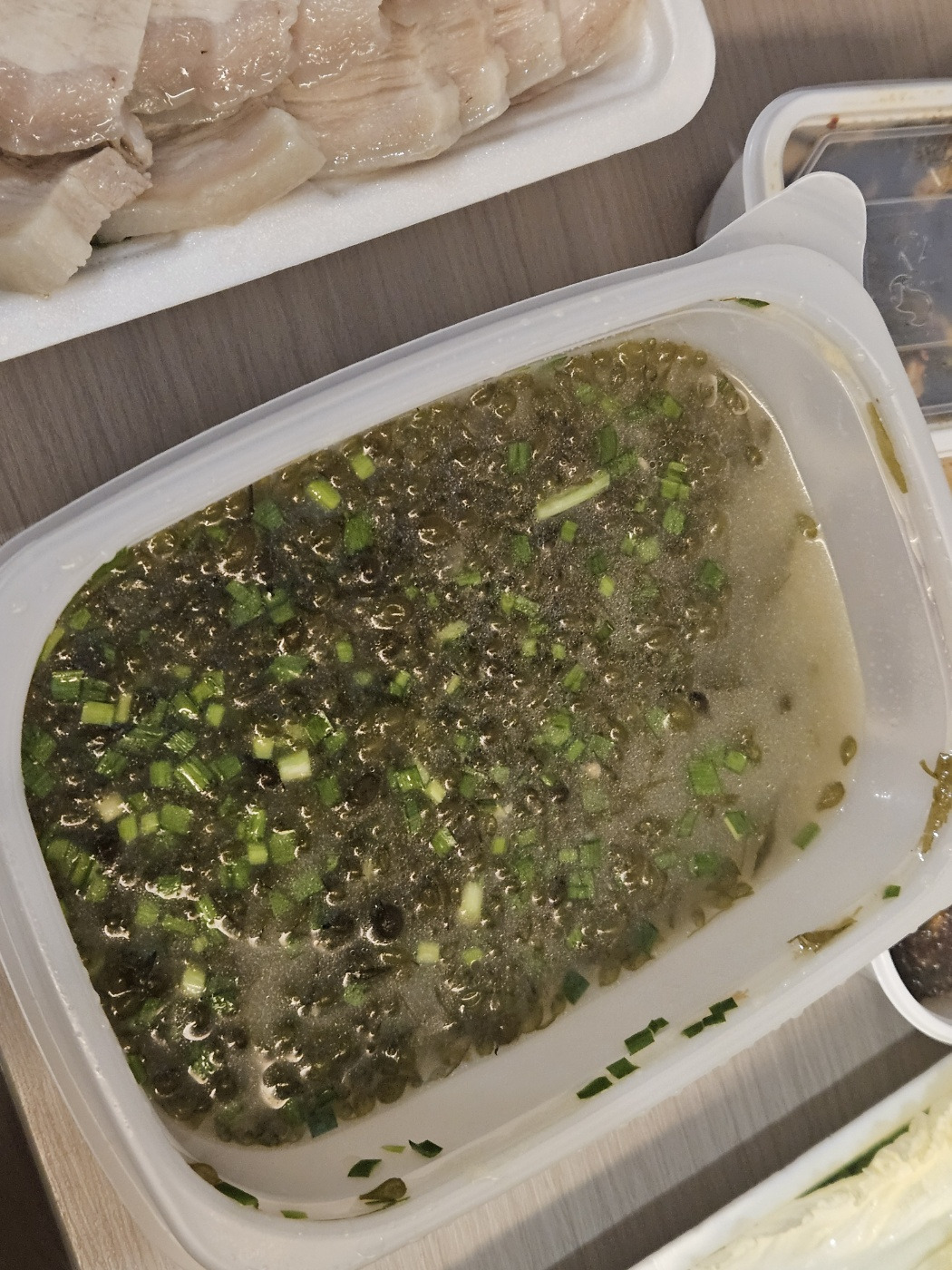 각종 소스들도 이 집의 별미다. 갈치속젓 또는 멜젓으로 추정되는 소스와 간장소스, 초장까지. 먹는 방법을 소개하자면 돔베고기를 간장에 먼저 찍어먹어 고기의 맛을 느껴본 후 다음은 해초랑 싸서 초장이랑, 그리고 편마늘과 쌈장과 함께. 이런 순서로 먹어보면 돔베고기의 맛을 더 느낄 수 있다. 마지막은 갈치속젓 또는 멜젓으로 추정되는 소스와 함께 먹으면 육지와 해상의 조화를 느낄 수도...