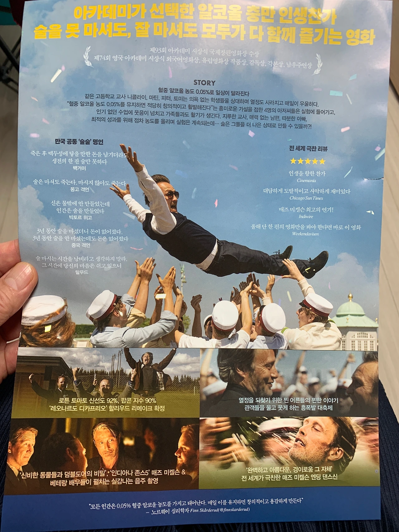 거의 30년 전 사건을 소환하게 된 것은 어제 본 이 영화 때문입니다. “혈중 알코올 농도가 0.05%를 유지한다면, 적당히 창의적이고 활기차게 인생을 살 수 있다.” 동의하시나요? 술을 마셔본 사람들은 고개를 끄덕일만한 이 가설을 증명하기 위해 나선 덴마크의 아재 4명이 벌이는 포복절도 & 감동의 영화입니다. 원제는 ‘DRUK’으로 덴마크어 사전을 찾아보니 음주라는 뜻이네요. 음주를 소재로 삼은 정말 유쾌하고 재밌고, 공감가고! 감동이 있는 영화 ‘어나더 라운드’ 입니다. 간만에 실컷 웃게 해주고, 가슴을 따스하게 해주고, 열정을 되찾게 해준 영화입니다.