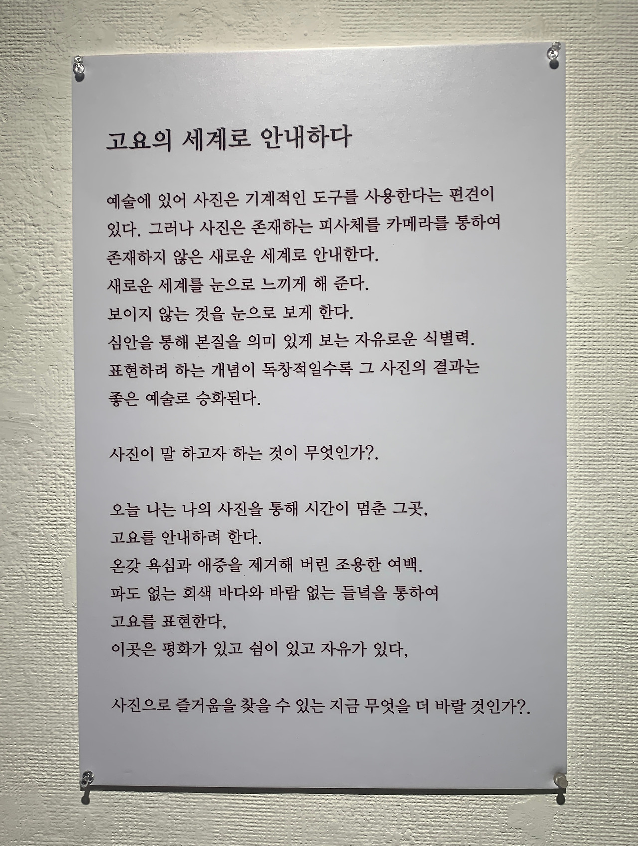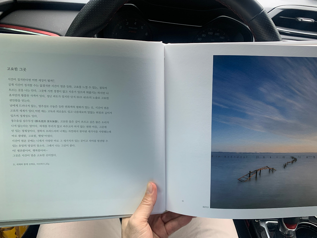 사진도록이라기 보다 수상록에 가까운 책을 선물로 받았습니다. 교수님의 생각과 철학이 사진뿐 아니라 글로도 표현되어 있습니다. 집에 가서 찬찬히 읽어보며 마음을 다스리며 고요를 누리는 법을 배워야겠습니다.