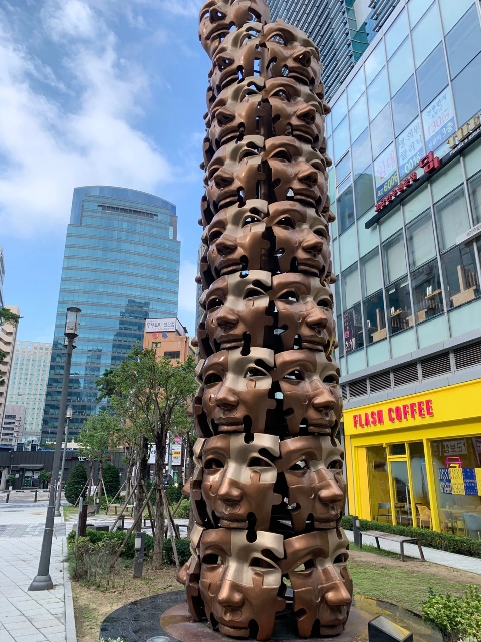 서울 중구 다동 YG빌딩 앞에는 황동빛의 가면들이 층층이 쌓여 탑을 이룬 조형물이 있다.
