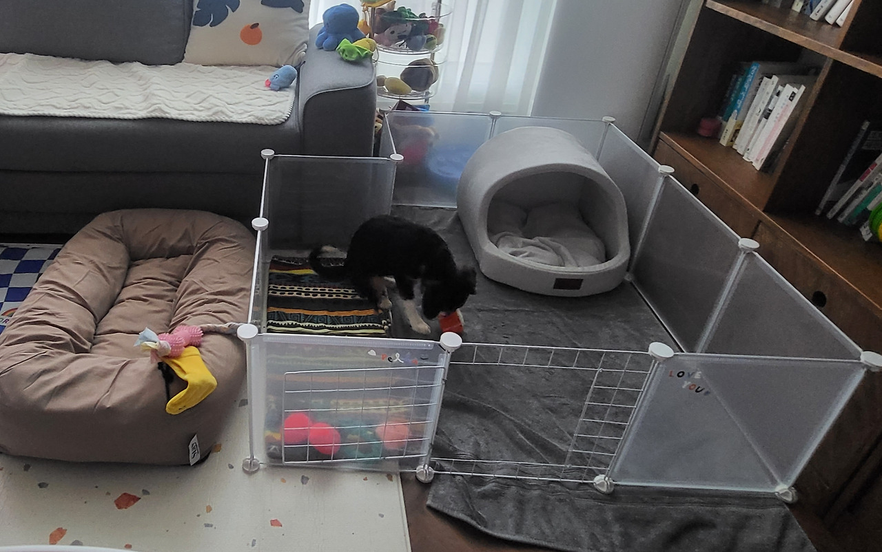 펠라의 주요 거처도 화장실과 먼 곳으로 옮겨 주었다. 울타리에 대한 집착을 버리지 못한 이유는 혹시나 펠라가 심리적 안정감을 느끼지 않을까 해서 그랬다. 문을 열어놓고 마음대로 오고 갈 수 있게 해 줬다. 그랬더니 다행히 울타리를 뛰어넘어 다니진 않았다. 좋아하는 장난감과 노즈 워크를 넣어뒀더니 혼자 들어가서 노는 시간도 제법 늘었다. 하지만 동굴 침대는 사용하지 않았다. 펠라가 폭풍 성장을 하고 있어서 금세 작아진 것도 이유일 것이다. 왼쪽에 있는 무늬의 침대와 소파에 더 오래 머물렀다. 내 마음대로 되는 건 없었다. 아니, 펠라의 마음을 잘 모르고 있었다고 말하는 게 맞겠다. 펠라도 답답했겠다.