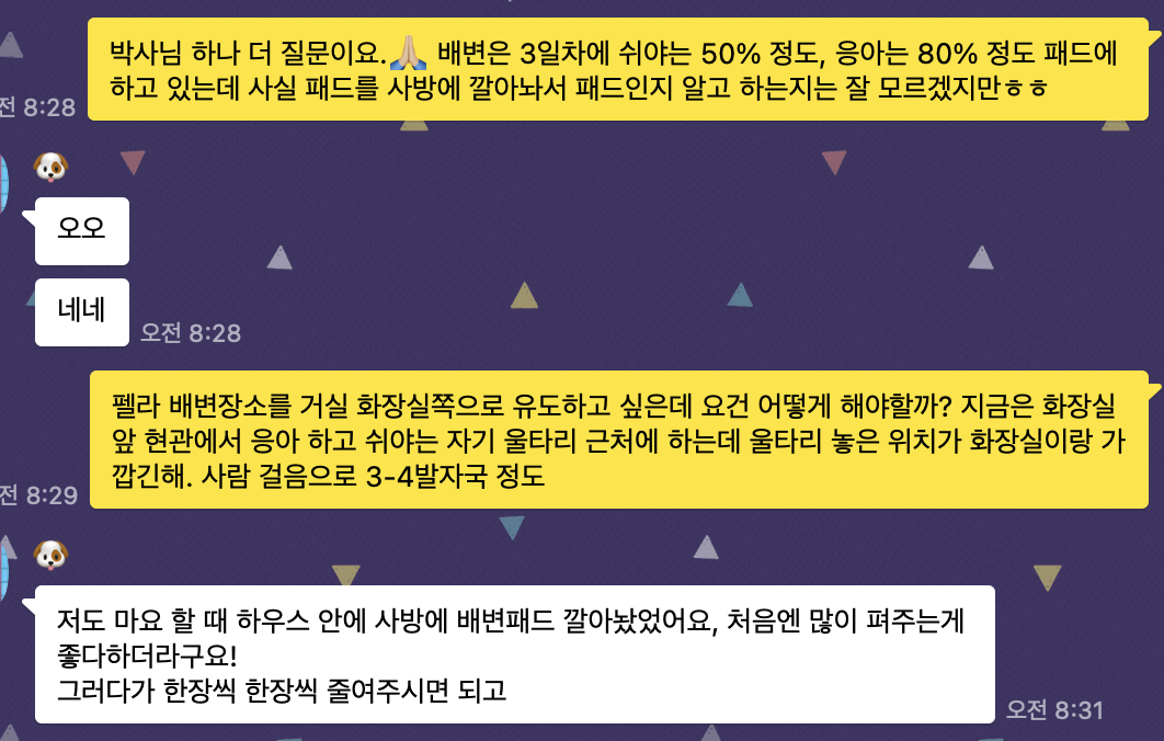 나는 초보 임보 자인 데다 퍼피 케어를 해본 경험이 한 15년 전 본가의 강아지 때의 까마득한 기억뿐이었다. 매일 세탁기를 돌리며 점점 자신이 없어졌다. 펠라가 멋진 강아지로 성장할 수 있도록 도와서, 신중하고 사려 깊은 가족을 만나게 해야 했다. 그러기 위해선 펠라가 우리 집에 익숙해지는 속도에 맞춰 퍼피 교육의 진도도 함께 해나가야 한다고 생각했다. 가장 시급한 배변 교육은 더욱 중요했다. 결국 임시보호를 자주 하는 친구들과의 단톡방에 장문의 톡을 남겼다.