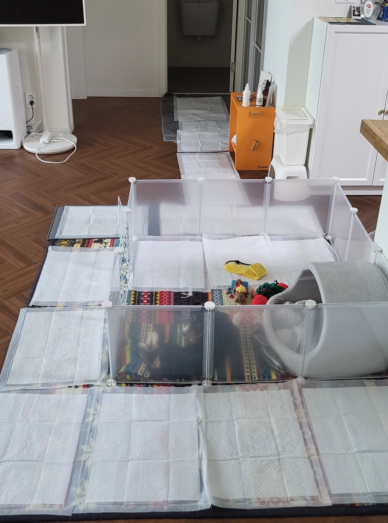 울타리는 금세 쓸모를 잃었다. 아이러니하게도 울타리 안의 작은 공간만 제외하고 거실 전체가 펠라의 공간으로 변했다. 혹시나 하는 마음에 울타리 안쪽에 정을 붙이라고 밥을 그 안에 줬더니 밥만 먹고 후딱 나오게 되었다. 거실이 곧 펠라의 놀이방이자, 침실이자, 식사 장소, 그리고 화장실이기도 하게 되었다.