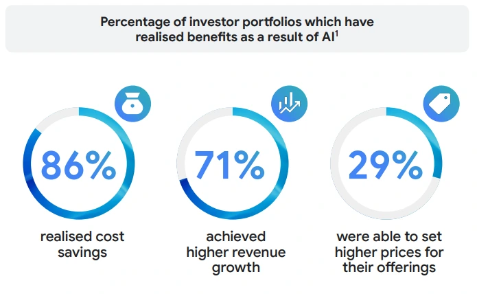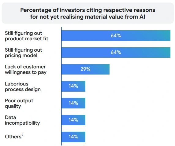 대부분의 VC들은 AI에 기대하는 효익은 비용 절감 요인(86%), 높은 수익성(71%), 가격 인상 요인(29%) 등을 제기했습니다.