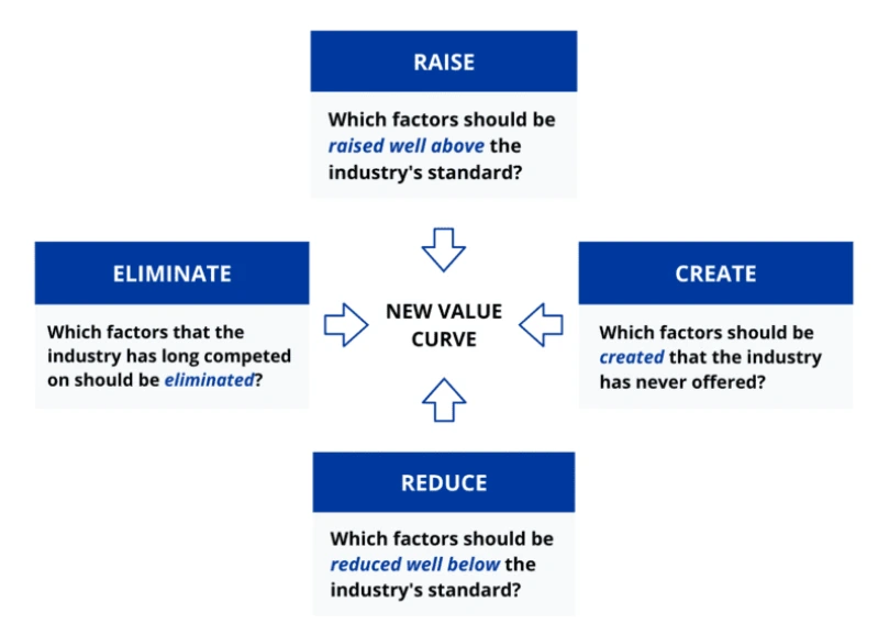 우리에게 익숙하게 잘 알려진, 핵심 개념 경쟁이 치열한 Red Ocean을 벗어나, 경쟁이 없는 새로운 시장 공간(Blue Ocean)을 창출하는 전략이죠.