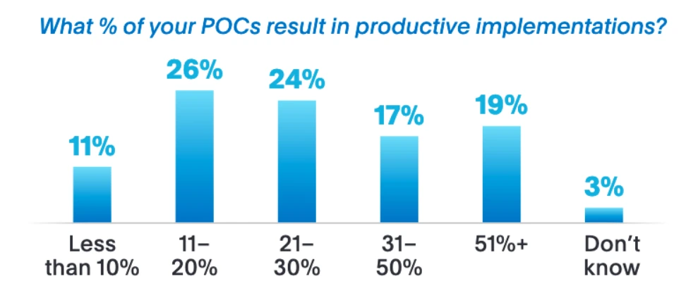 모든 PoC가 성공하는 건 아닙니다. 사실 실패율이 더 높죠. Sapphire Ventures의 조사에 따르면 Global 2,000 기업 IT 임원의 78%가 "참여한 PoC 중 절반 이하만 실제 도입으로 이어진다"고 답했습니다.