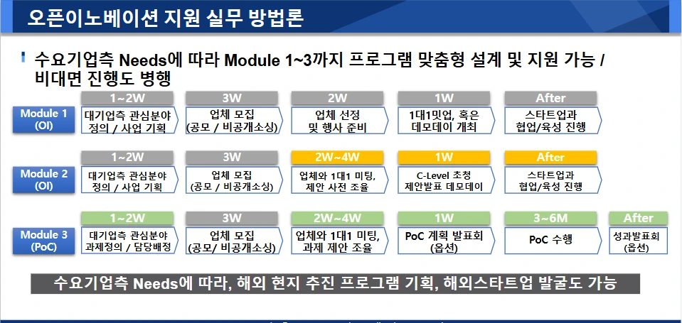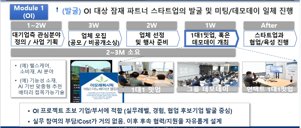 최적 활용 시나리오: 수요기업이 다양한 분야를 탐색하는 초기 단계이거나, 참여 스타트업의 퀄리티가 검증된 경우에 활용하면 좋습니다.
