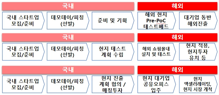 앞서 보았던 모드 1~3를 글로벌 필드와 결합하여 조립하면 다양한 유형이 해외 poc 및 테스트, 현지 엑셀러레이팅 사례를 만들 수 있습니다. 2020년도에 LG상사, 롯데마트, 대원칸타빌 등 다양한 영역에서 글로벌 오픈 이노베이션 시도들이 있었습니다.