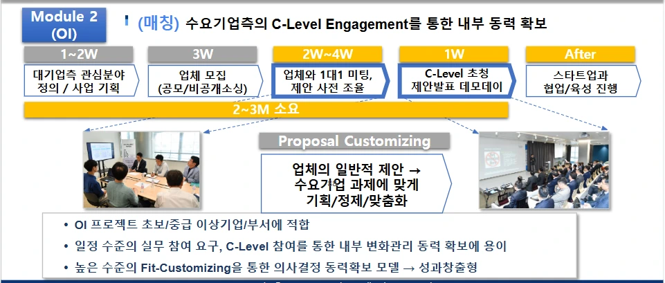 구조: 모드2는 C레벨 등 명확한 타겟을 대상으로, 실무미팅을 통해 발표 내용을 제안서 등 통일된 형식으로 커스터마이징하여 진행하는 방식입니다. 보통 이는 스타트업 입장에서 기약 없는 품이 들어가고, 대기업측의 요구사항이 많아질 수밖에 없어, 보통 C레벨을 겨냥하거나 일관된 메시지로 설득해야하는 사업을 전제로 하는 만큼, 사전 준비의 밀도가 완전히 다릅니다. 스타트업별로 1~2회의 실무미팅을 거쳐 발표 내용을 수요기업의 페인포인트에 맞춰 재구성합니다.