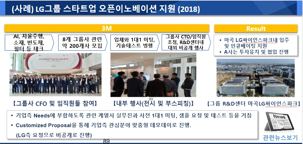 20개사가 선발되어, 전시부스 형태로 참여하여, 통일된 레이아웃과 논리구조로, 행사 전날까지 정비해 만들었습니다. 보통 이 경우는, 수요기업의 문제 현황과, 그에 대한 스타트업의 강점과 차별화 포인트, 그리고 오픈이노베이션 제안의 3단 구조로 짜는 경우가 많습니다. 8개 계열사와 LG사이언스파크의 대표 및 임원들이 전체 20개 사를 회람하며 5분 내외의 시간을 집중해서 논의했습니다. 방식에 대해서는 호불호가 있을 수 있지만, C레벨에게 실무선을 걸러 처음 선보이며 바로 가능성을 탐색해보는 방법으로는 효율적이었습니다. 실제로, 이 결과, 사전에 LG그룹측과 교감이 있었던 곳 중심으로, 나중에 LG사이언스파크에 입주하여 협업과 PoC를 추진하거나 시드 투자를 받은 곳들이 일부 생겨났고, 이와 같은 학습과 경험이 밑바탕이 되어, 나중에 자력으로 상장에 성공한 AI 스타트업 1개, 바이오 스타트업 1개, 자율주행 관련 스타트업 1개가 나왔습니다.