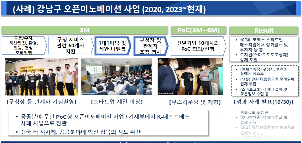 그리고 무엇보다, 강남구 오픈이노베이션은 지자체 최초의 시도로 각인되어 이후 기재부의 K-TESTBED의 모델 사업으로 벤치마킹되기도 하였고, 이 경험이 축적되어, 매년 혹은 격년으로 이어지는 강남구 정례 사업이 되었고, (팀장님은 과장님으로 승진했으며 ^^) 이제는 예산도 확보되어 정말 PoC가 이어지는 사례가 되었습니다. 오픈이노베이션에서 축적의 힘은, 정말 중요하죠.