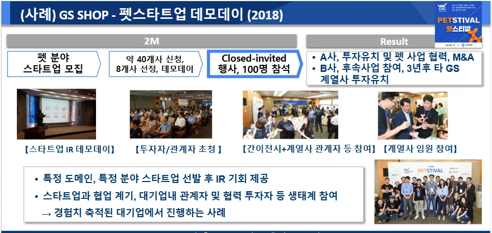 2018년 당시 활발한 벤처링 활동을 보여온 GS홈쇼핑은 GWG(Grow with GS)라는 명칭의 데모데이를 지속했습니다. 특정 분야의 스타트업들을 모집하여 데모데이를 개최하고, 정해진 시간 내에 자유롭게 발표하고, 네트워킹으로 이어지는, 전형적인 Mode 1 방식 매칭입니다. 이 과정에서 오픈이노베이션 관계자나 파트너기관들, 내부 및 외부 제3의 투자자 등을 초청해 비공개이나 외부에 열려 있는 만남들을 만듭니다.