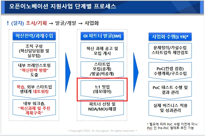 좋은 스타트업을 발굴하는 것도 중요합니다. 수요기업의 니즈를 정확히 파악하는 것도 중요합니다. 하지만 그보다 더 중요한 것은, 이 둘이 만나는 방식을 상황에 맞게 설계하고, 그 만남 이후의 여정을 치밀하게 구조화하는 것이죠.