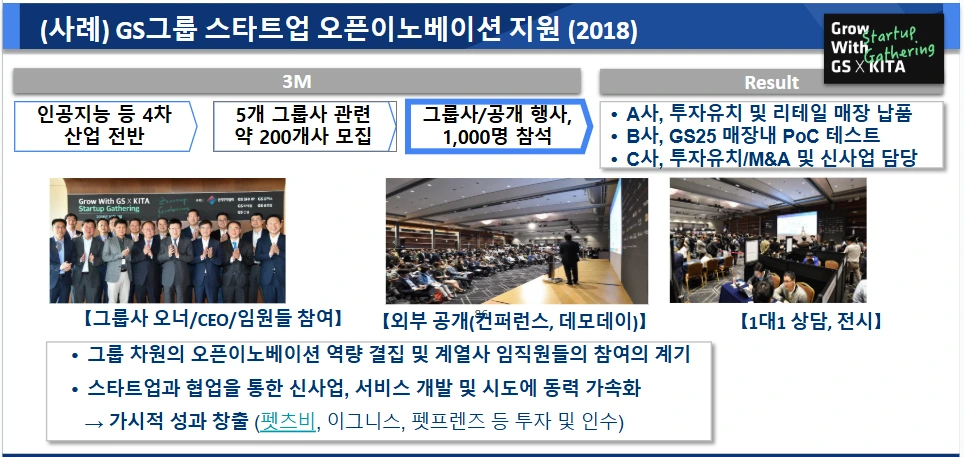 이를 강화하여, 2018년 GS그룹 전체가 참여하는 그룹 규모의 GWG를 업그레이드하여 진행했습니다. GS홈쇼핑/칼텍스/리테일/건설/글로벌 등 5개사의 관련 임직원들이 모두 참여했고 5개 그룹사에서 신사업을 담당하는 정예 멤버들로 TF를 함께 꾸려 4개월간 준비해 그룹 차원의, 오픈이노베이션 활성화의 계기를 마련하고 내부에 혁신 DNA를 전파하는 의미를 함께 담아 그야말로 Grow With GS 행사를 치렀습니다.
