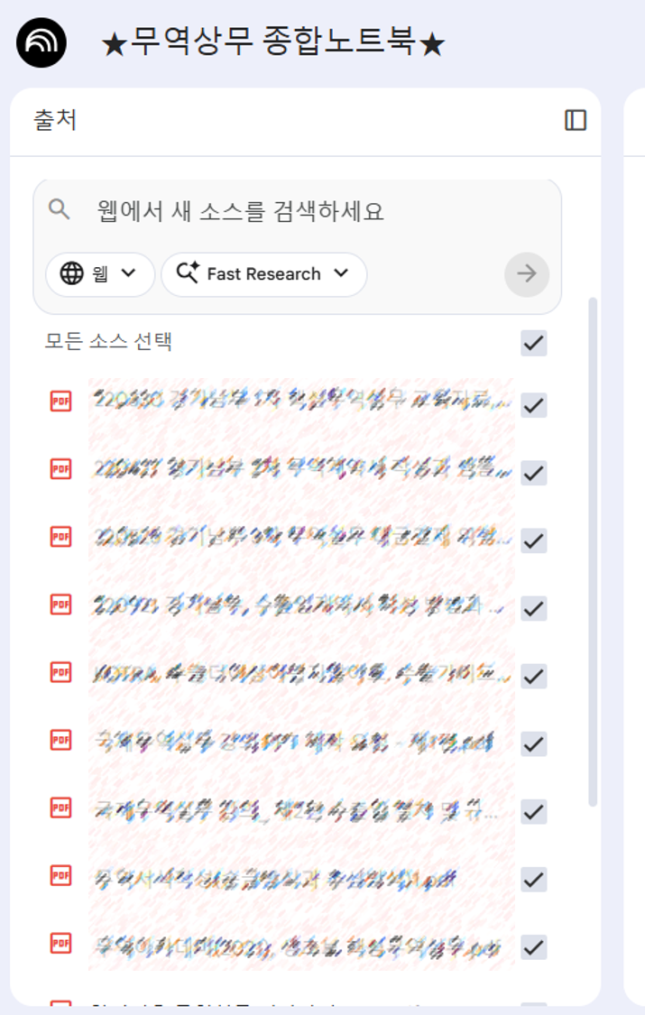 저는 인터넷에서 구글링해 수집한 공개된 수출 실무 자료들(PDF, 텍스트 파일 등)을 노트북LM에 업로드했습니다.
