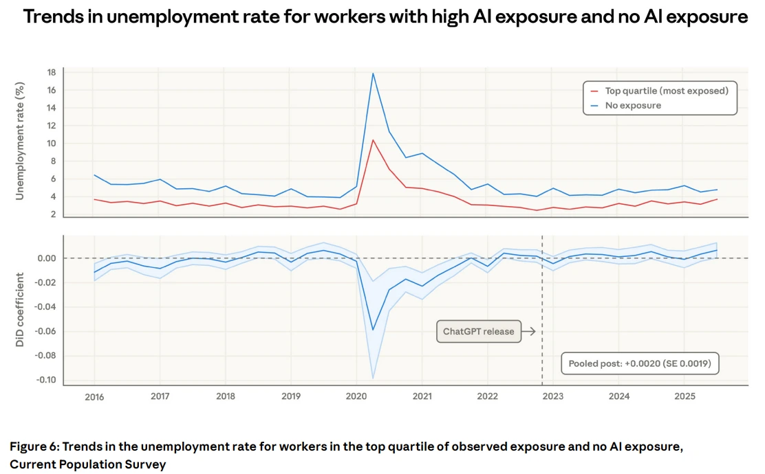 그렇다면 실제로 AI 노출도 높은 직종 종사자들의 실업률이 올라가고 있을까요?