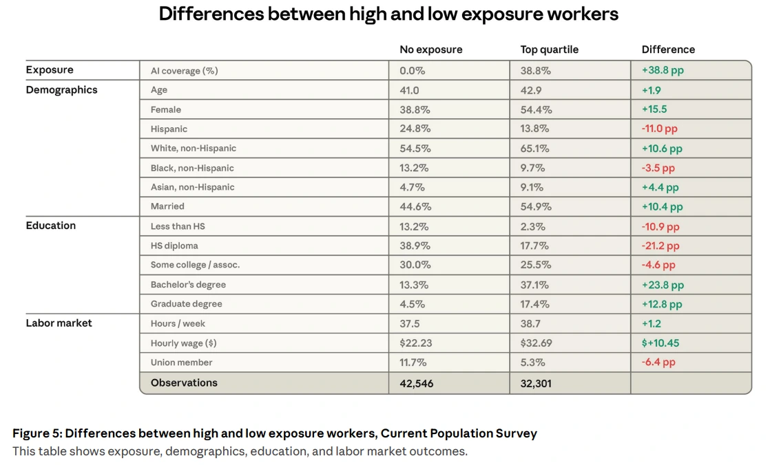 보고서에서 꽤 충격적인 섹션이 하나 있습니다. AI 노출도 상위 25% 직종 종사자와 노출도 0% 직종 종사자를 비교한 표인데요, 인구통계학적으로 두 그룹이 크게 다릅니다.