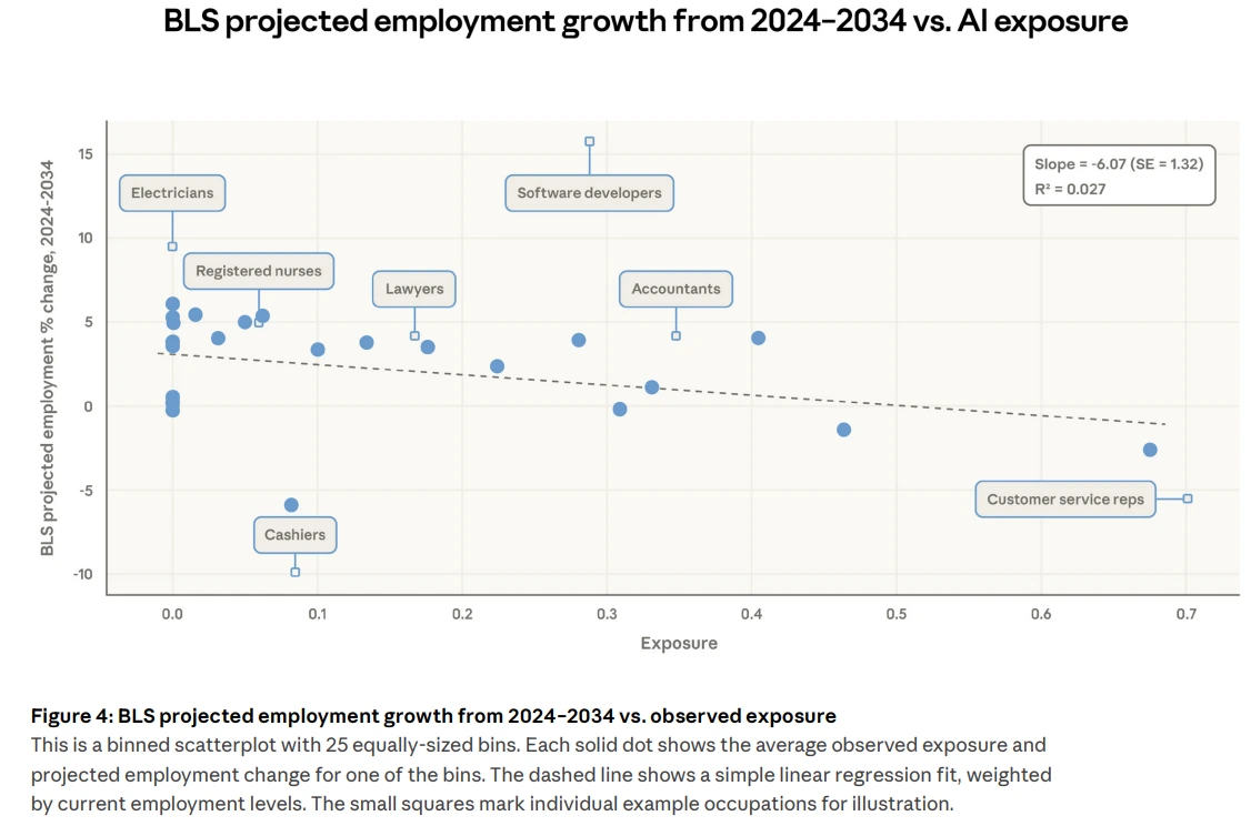 그 자체로 수치가 크지는 않습니다만, 중요한 포인트가 하나 있습니다. 이론적 노출도인 Eloundou et al.의 β 지표만 사용했을 때는 이런 상관관계가 없었습니다. 이론적 가능성이 아니라, 실제 사용 데이터를 기반으로 한 관찰된 노출도만이 BLS 전망과 연관성을 보인다는 거죠. 이는 새 지표의 타당성을 간접적으로 검증해줍니다. 노동시장 전문 분석가들도 이미 비슷한 방향을 바라보고 있었던 겁니다.
