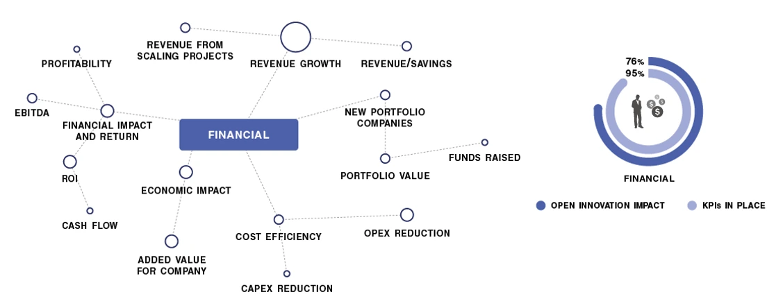 그렇다면 기업들은 어떤 KPI로 오픈 이노베이션 성과를 측정하고 있을까요? 보고서에 제시된 내용을 보면, 현재 가장 폭넓게 활용되는 지표는 재무적 임팩트(Financial Impact)입니다. 거의 모든 기업(95%)이 비용 절감, 신규 매출 성장, ROI 등 금전적 성과를 추적하는 KPI를 두고 있다고 합니다. 이는 혁신 활동의 결과를 가장 직접적으로 드러내는 수치들이기 때문에 경영진 설득에도 용이하고, 오래전부터 사용되어 온 측정 기준이기 때문입니다.